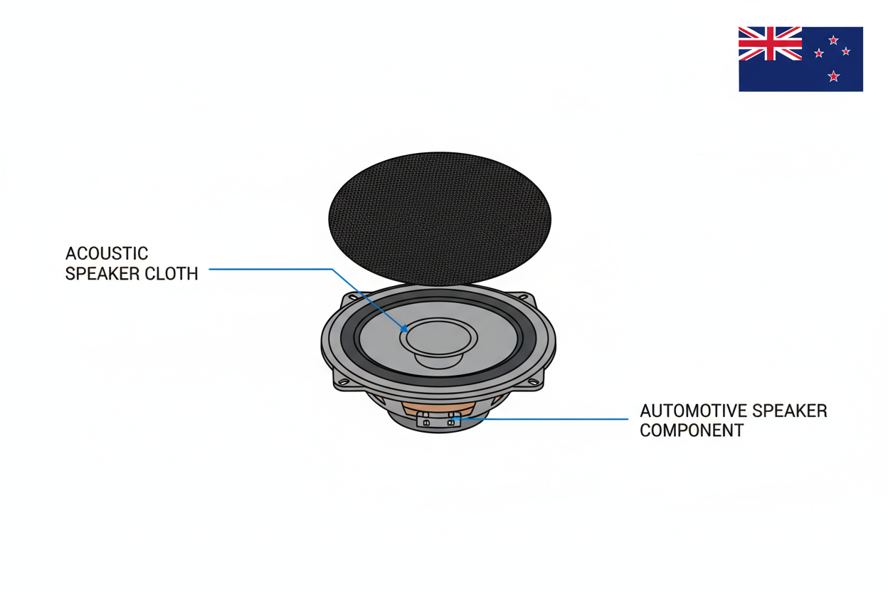solid black cloth for auto speaker , with exploded diagram showing fabric on face of auto speaker , small nz flag top right corner